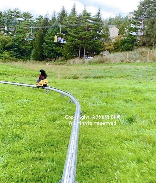 요즘 평창 가볼만한곳 베스트 10으로 최고의 스릴을 자랑하는 마운틴코스터가 있어요. 총 길이 1,300m에 최고 시속 40km를 자랑하는 용평리조트의 마운틴 코스터는 비주얼은 마치 어린이용 같지만 만만하게 봤다가 급경사와 커브에 놀랄게 되는 액티비티입니다.