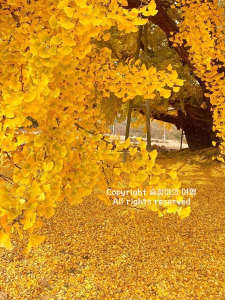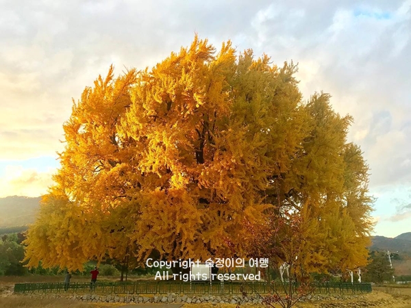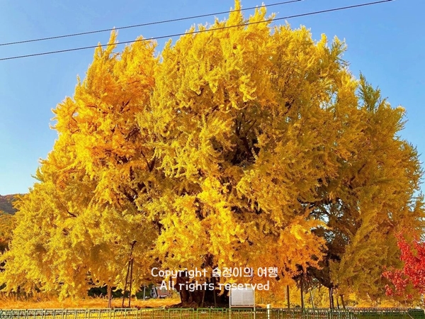 입구보다는 은행나무밑 푯말을 정면으로 보이는 곳에서 사진을 찍으면 풍성하게 예쁜 은행나무를 담을 수 있습니다. 800년 정도 된 이 나무는 지금까지 건강하게 자라고 있고 줄기와 가지가 균형 있게 잘 퍼져서 보호수 은행나무 가운데 가장 아름다운 나무로 꼽히고 있습니다.