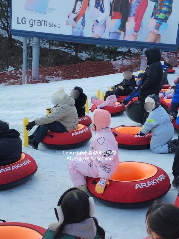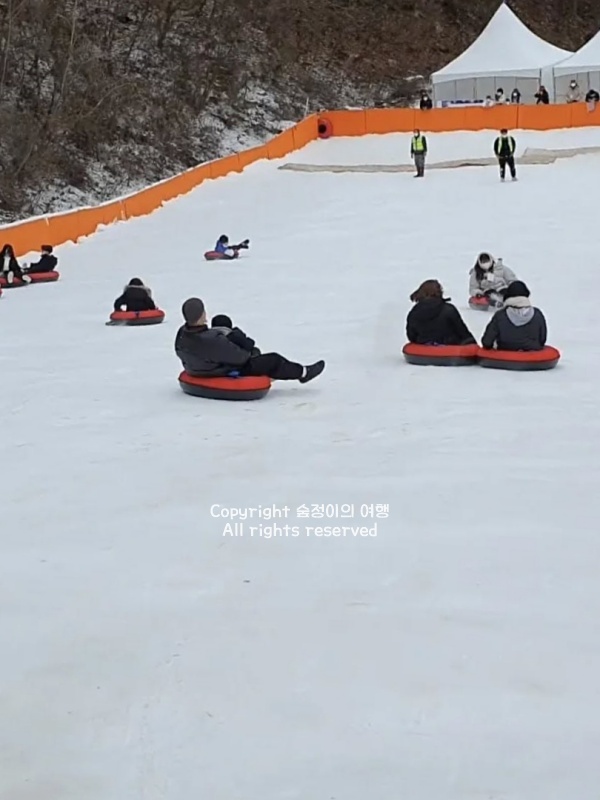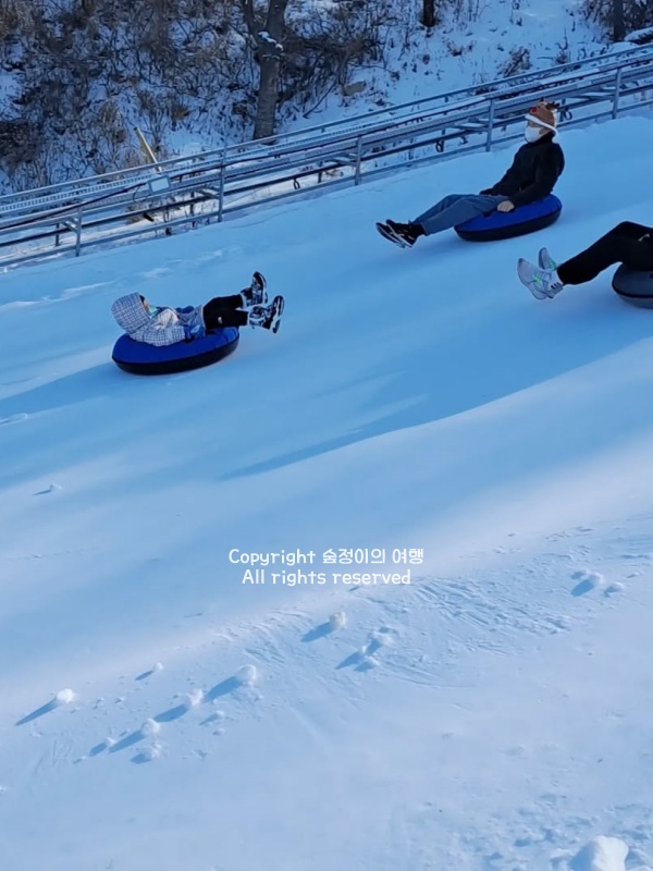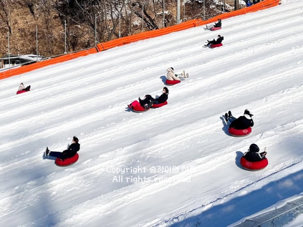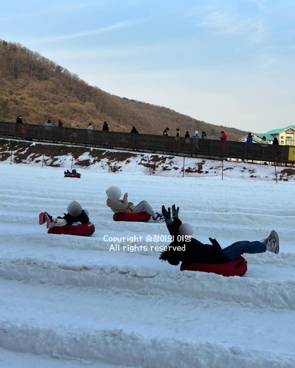 평지 쪽에 마련된 널찍한 공간에 하얀 눈이 가득 덮여 있었고, 아이들은 이미 튜브 썰매를 타고 미끄러진다. 눈 위를 질주하는 소리와 뒤따라 웃는 목소리가 계속 들려온다.