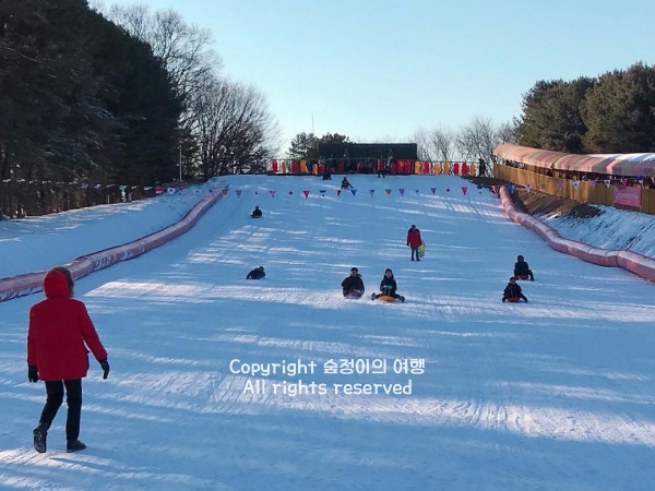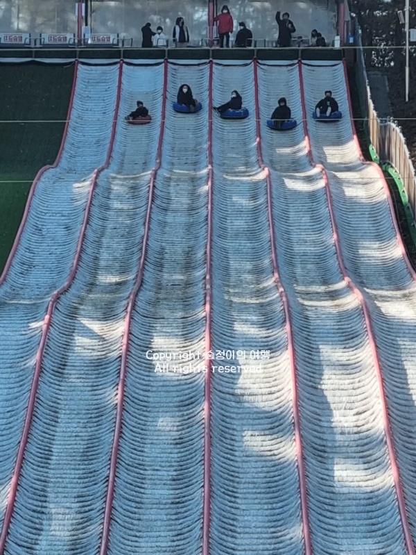 눈썰매장은 튜브를 타고 경사면을 따라 내려오는 방식이다. 생각보다 경사가 꽤 있어서, 아이들은 물론 어른들도 소리 지르며 내려간다. 한 번 타고 나면 금방 다시 올라간다. 썰매 들고 뛰어다니는 사람들로 트랙 옆이 늘 분주하다.