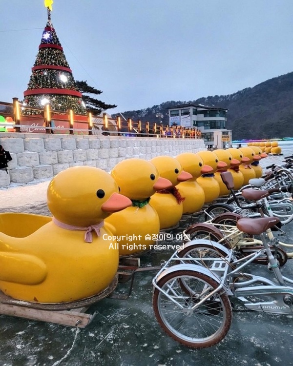 산정호수 썰매축제는 얼어붙은 호수 위에서 오리썰매, 펭귄썰매, 세발자전거 썰매 등을 직접 타보는 겨울 체험이 주가 되는 장소 곳입니다. 얼음판 가운데 오리 썰매 꼬리, 펭귄 썰매 안장, 세발자전거 바퀴를 손님들이 탑승구 앞에서 줄 서서 기대하고 있고 바람이 차가운 날에도 참가자들이 얼음 위 러버덕 기차 탑승권, 스노우바이크 핸들, 헬멧을 챙겨 탑니다.