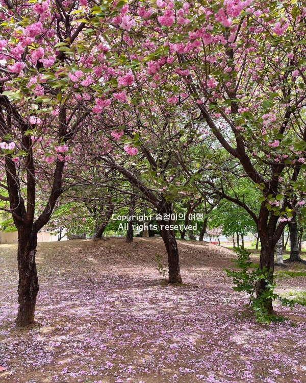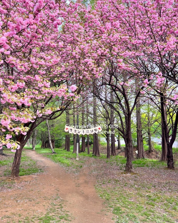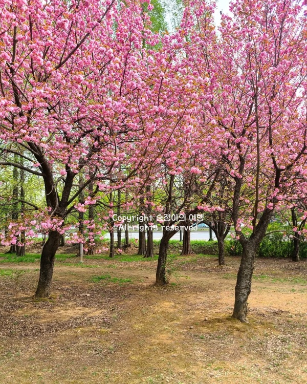 작년에 4월 중순쯤 방문했을 때, 공원 입구에 들어서자마자 분홍빛 겹벚꽃이 가득한 길이 펼쳐졌습니다. 일반 벚꽃보다 묵직한 꽃잎이 바람에 흔들릴 때마다 부드럽게 출렁이는 모습이 인상적이었죠. 산책로를 따라 걷다 보면 어느 순간 꽃잎이 비처럼 흩날리는 구간이 나오는데, 그곳에서 한참을 서서 눈앞에 펼쳐지는 풍경을 바라봤던 기억이 납니다. 사진을 찍는 사람들도 많았고, 돗자리를 펴고 소풍을 즐기는 가족들도 곳곳에서 보였습니다. 공원 안쪽으로 들어가면 성호기념관과 단원조각공원이 있는데, 이곳에서도 겹벚꽃을 배경으로 멋진 사진을 남길 수 있습니다.