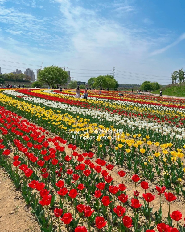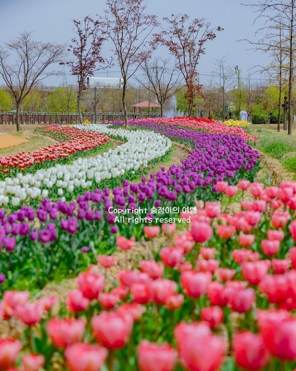 4월 중순부터 5월까지, 공릉천 산책로를 따라 튤립이 활짝 피어나면서 강변이 화사한 색으로 물드는 경기도 봄여행 가볼만한곳 베스트 10입니다. 강을 따라 길게 이어지는 꽃길을 걷자니 정말 꽃길만 걷고 싶은 봄입니다. 튤립밭은 붉은색, 노란색, 보라색 등 다양한 색깔로 조성되어 있고, 중간중간 한평정원과 작은 쉼터가 있어 여유롭게 머물며 감상하기에 좋습니다. 봄이 무르익을수록 강변을 따라 산책하는 사람들이 많아지는데, 자전거를 타고 가볍게 돌아보거나 벤치에 앉아 강바람을 맞으며 시간을 보내기에도 적당한 곳입니다.