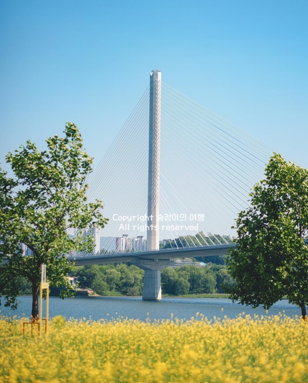 유채꽃밭 사이로 난 길을 천천히 걷다 보면 눈앞이 온통 노란 물결로 가득 차는데, 한강변에서 불어오는 시원한 바람과 꽃향기가 어우러져 기분까지 맑아지는 느낌이었죠. 아이들은 꽃 사이를 신나게 뛰어다니고, 연인들은 서로 사진을 찍어주며 추억을 남기고 있었습니다. 돗자리를 펴고 여유를 즐기는 사람들이 많았는데, 바쁜 일상에서 벗어나 한적한 강변을 따라 걸으며 봄의 끝자락을 만끽하고 싶다면, 꼭 한 번 들러보길 추천합니다.
