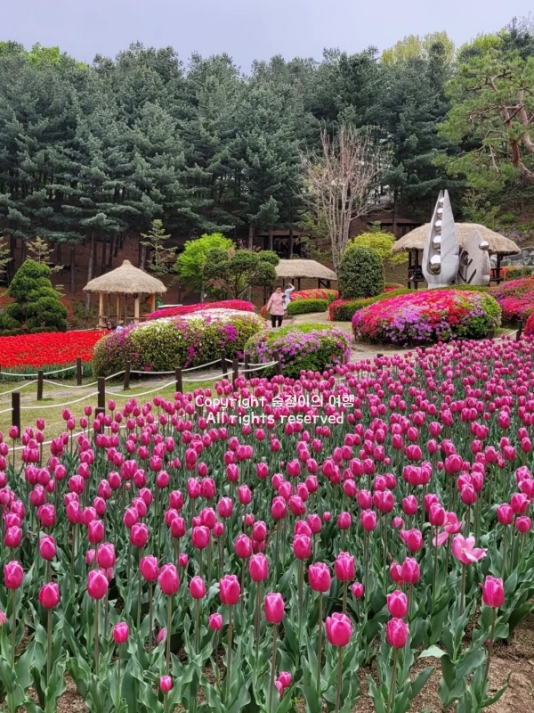 벚꽃이 우거진 길을 따라 걸으며 꽃잎이 흩어지는 모습을 바라보는 것만으로도 봄이 성큼 다가왔다는 걸 실감할 수 있었죠. 4월 중순이 지나 벚꽃이 지면서 튤립이 본격적으로 피어나기 시작했고, 수목원 곳곳이 색색의 꽃들로 뒤덮였습니다. 햇빛을 받으며 반짝이는 튤립꽃들은 봄날의 따뜻한 기운을 그대로 전해주는 듯했어요. 봄날의 변화를 가까이에서 느끼고 싶다면, 4월 초부터 5월 초 사이에 한 번쯤 찾아가 보세요.