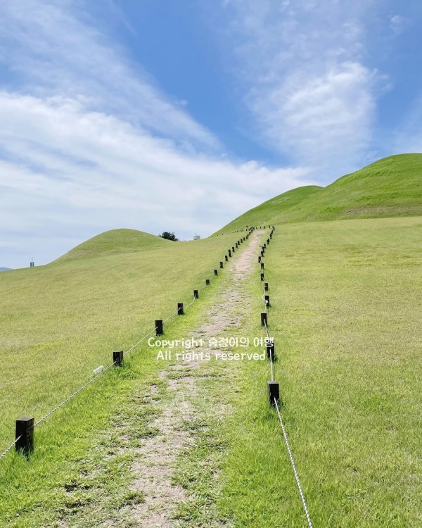 송학동 고분군은 사진 찍기 정말 좋은 곳으로, 어떤 각도에서 찍어도 한 폭의 그림 같은 풍경이 나옵니다. 파란 하늘 아래 펼쳐진 푸른 고분군은 외국의 어느 초원을 떠올리게 하고, 그 자체로 힐링을 선사해줍니다. 특히 일몰 시간대에 방문하면 더욱 감동적인 풍경을 만날 수 있어요.