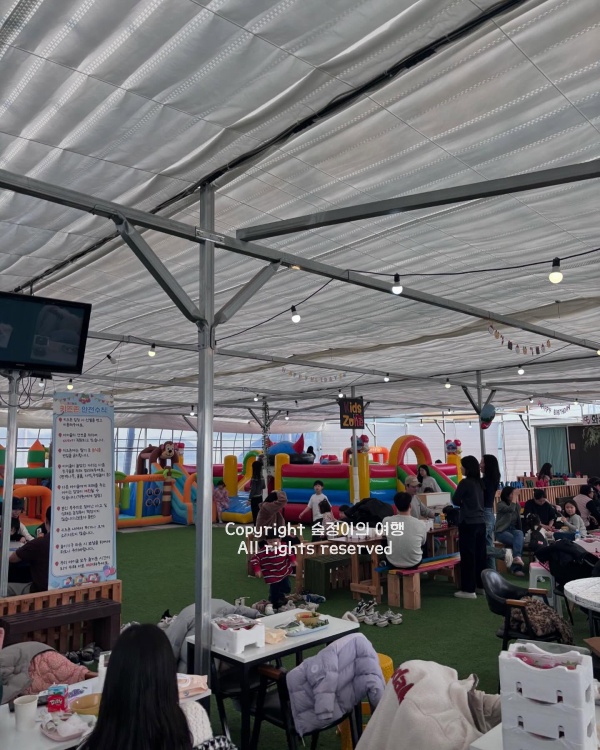아이들 뛰놀기 좋은 초대형 에어바운스 존, 편백나무 향 가득한 휴식 공간, 그리고 색연필 들고 그리다 보면 시간 가는 줄 모를 그림놀이 공간까지. 부모님은 커피 한 잔 들고 여유롭게 쉴 수 있는 공간도 마련되어 있답니다.