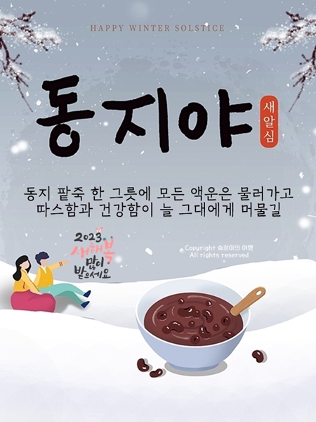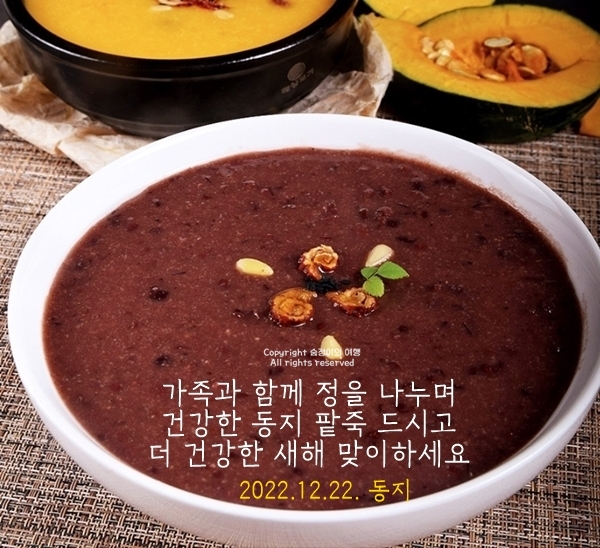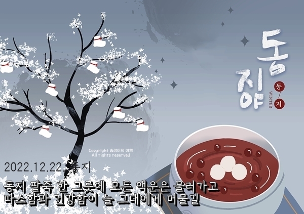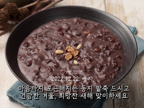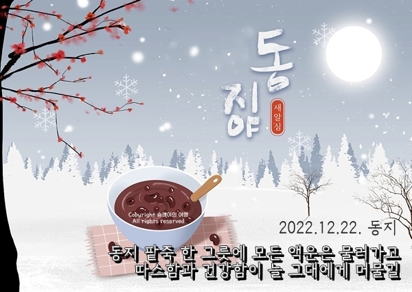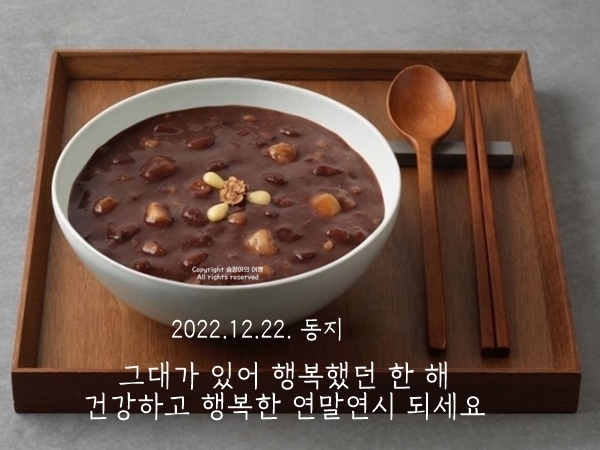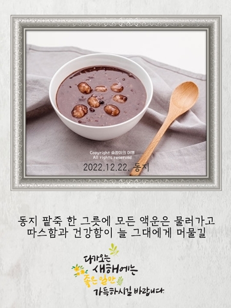 ○○님 웃음도 많았고 탈도 많았던 2022년이 저물어 가고 있습니다. 오늘은 특히 낮이 가장 짧다는 동지라서 시간이 무척 빨리 가는 느낌이 듭니다. 동지팥죽 드시고 액운타파하시고 늘 건강과 행복이 가득하길 바랍니다.