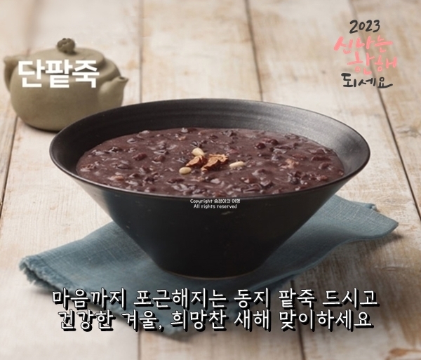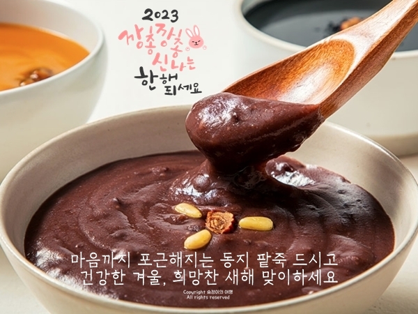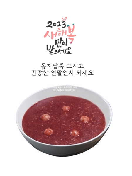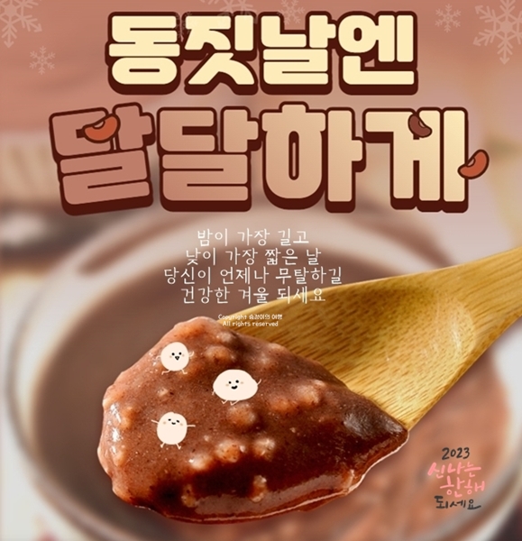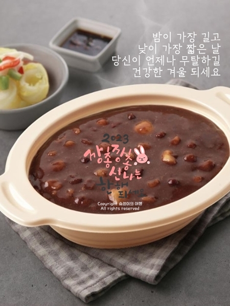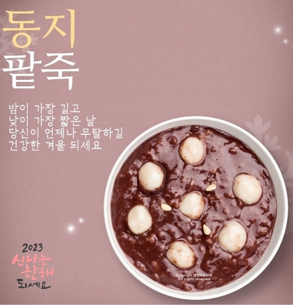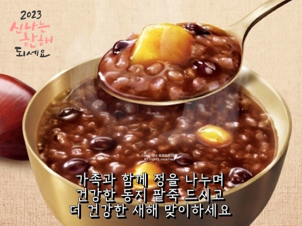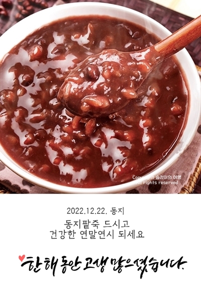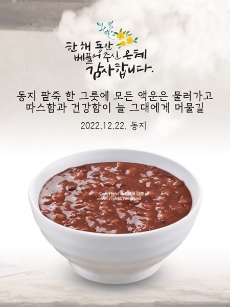 편의점에서도 쉽게 구할 수 있는 팥죽이지만 동짓날 먹는 팥죽은 참 의미가 깊은 것 같습니다. 한해를 무사히 보냈다는 안도감, 그리고 다가오는 2022년을 무사히 보낼 수 있도록 기원하는 마음이 담겨있겠지요. ○○님 팥죽 드시고 올한해 건강하게 마무리하시길 기원합니다.