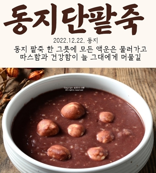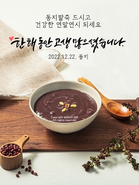 예쁘게 만들어본 동짓날 인사말 동지 인사 이미지였습니다. 요즘에는 동짓날 유래나 동짓날 의미에 큰 관심을 기울이는 분들을 찾아보기 힘든데 시골에 계신 부모님은 여전히 팥죽을 직접 만들고 팥물 뿌리는 시간도 지켜서 예전의 풍습을 그대로 지키고 있습니다.