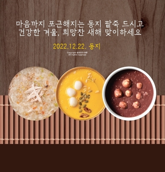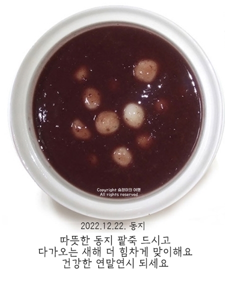 붉은 팥죽을 먹으며 한해 액운을 막아낼 수 있다고 하죠. 오늘 밤은 가장 길다고 하니 달달하고 영양만점 팥죽을 가족들과 드셔보시면 어떨까요? 한해 마무리 잘 하시고 곧 다가오는 크리스마스도 즐겁게 보내시길 바랍니다.