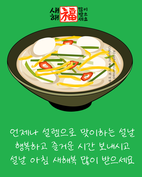 설날이니까 떡국 한 그릇 먹고 한 살 더 먹는 건 어때요? 걱정 마세요, 우리 모두 올해는 더 젊게 보이기로 약속했어요. 복 많이 받으세요!