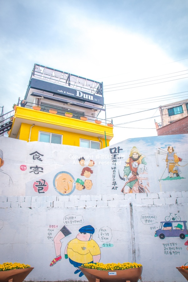 마을은 꽤 넓어서 걸어 다니는 시간은 개인에 따라 다를 것 같아요. 번화가 쪽 벽화만 빠르게 보면 30분이면 충분하지만, 골목길을 따라 천천히 걸으며 구석구석을 둘러보면 1시간 이상 걸릴 수도 있습니다. 색감이 화려해서 어디서 찍어도 사진이 잘 나왔고, 중간중간 감성적인 카페들도 있어서 커피 한 잔 마시며 쉬어가기에도 좋았어요.