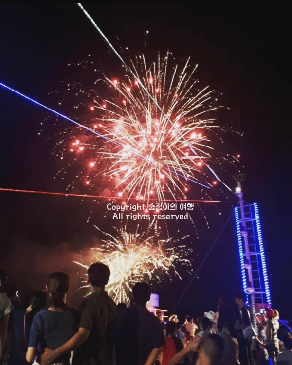 좋은 자리를 잡으려면 최대한 일찍 가는 게 중요해요. 4층 계단 앞 왼쪽 자리가 밤바다를 보기에 가장 좋은 위치였고, 불꽃놀이는 중앙 쪽이 바로 위 하늘에서 터져서 생생하게 즐길 수 있었습니다. 조금 떨어진 자리에서는 전체적인 모습을 한눈에 볼 수 있어서 각자 취향에 맞게 선택하면 될 것 같아요.