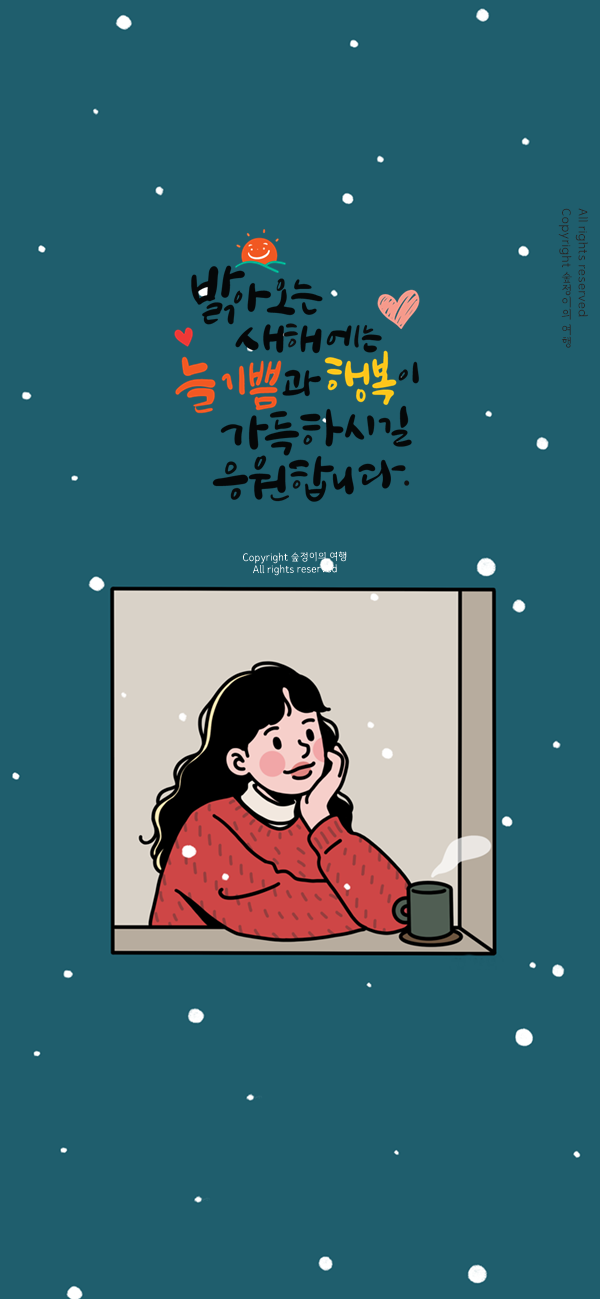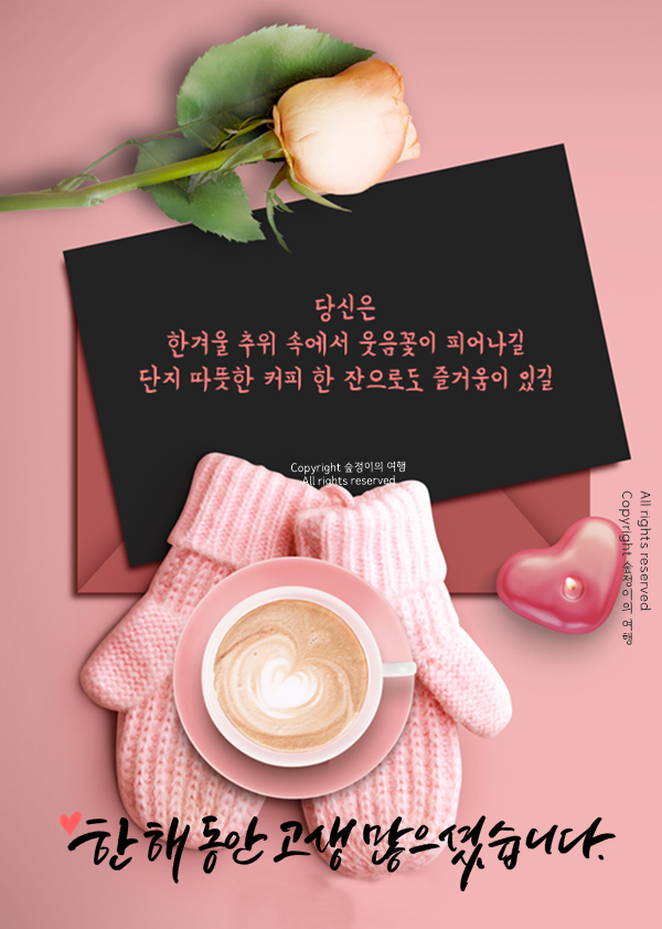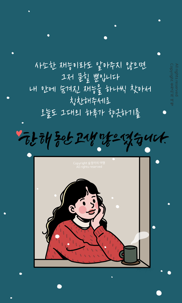 한 해 동안 열심히 달려오셨습니다. 이제는 잠시 멈추고 자신에게 따뜻한 위로를 전하는 연말의 시간을 가져보아도 좋겠습니다. 새해에도 사랑과 기쁨이 넘치는 하루하루가 되길 바랍니다. 밝은 내일로 향하는 2025년! 새해복 많이 받으세요.
