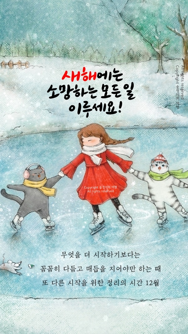 추운 계절이지만 다가올 새해의 설렘도 함께 느껴보세요. 차가운 겨울바람이 옷깃을 여미게 하는 계절, 우리는 또 한 해의 마지막 페이지를 써 내려가게 되겠지요.