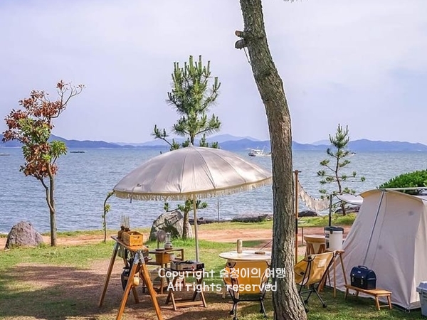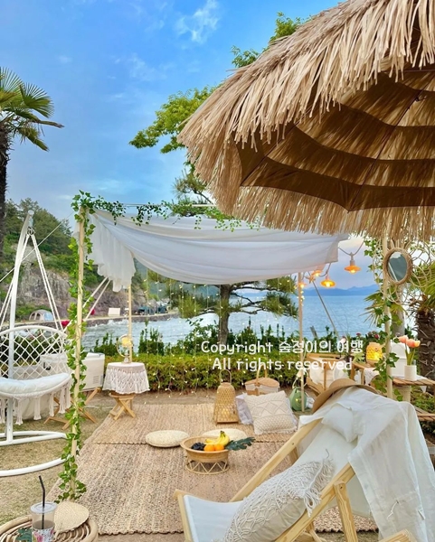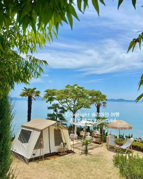 오션뷰 맛집으로 손에 꼽히는 캠핑장으로 해외여행 온듯한 발리 스타일이었습니다. 제가 이용한 b1사이트는 길쭉한 야자수와 넓게 펼쳐진 바다, 그리고 a사이트의 여러 텐트들이 다 보여서 보는 재미 가득했던 공간이었습니다. 야자수 심은 정원과 산책로가 있어 동남아 휴양지 느낌 가득하고 뷰맛집이라서 전남 캠핑장 찾는 분들께도 추천합니다.