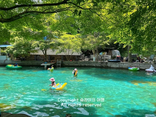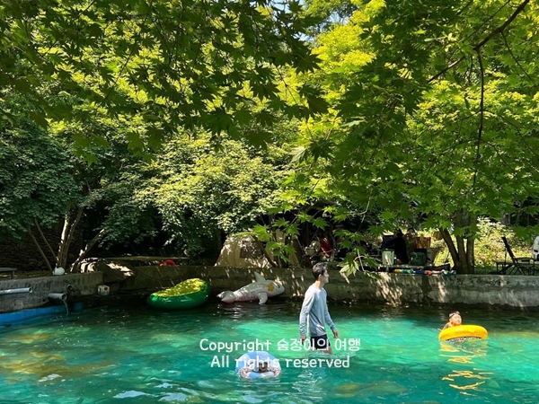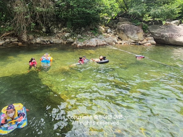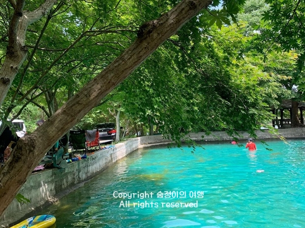 위쪽에는 평상이 있어 대여해서 텐트도 치고 고기도 구워 먹을 수 있는 곳이고 화장실 샤워실도 있어서 마음껏 물놀이, 또 편하게 놀 수 있는 여름 전남 구례 가볼만한곳 베스트 10입니다. 수심은 안쪽은 2m정도 되는 곳도 있고 밖쪽으로 나오면 아이들 놀기 좋은 다리까지 정도 수심도 있습니다. 어른, 아이 전부 놀기 좋은 곳이죠!