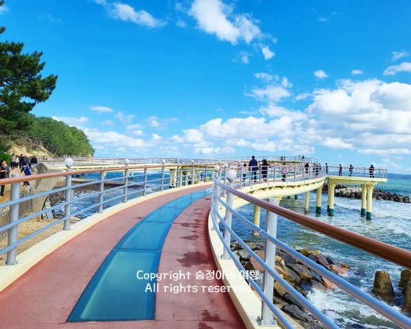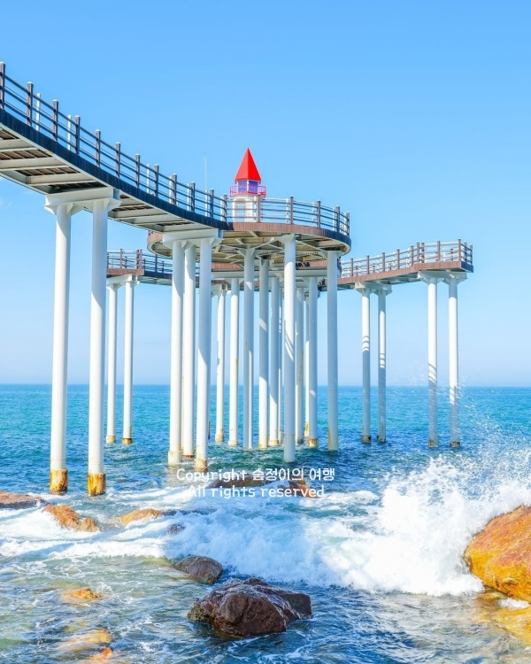 드라이브 코스와 카페거리로 알려진 여남동 해안에 국내에서 가장 긴 해상 스카이워크 평균 높이 7m, 총 길이 463m로 바다를 향해 롤러코스터처럼 구불구불 뻗어 나간 다리 위를 걸으면 발아래로 파도가 치고, 바닷바람이 정면으로 쏟아진다. 구간 곳곳에 깔린 투명 강화유리 바닥 위에 서면 흰 물거품이 그대로 올려다보여 발이 땅을 딛고 있다는 감각이 잠깐 사라진다.