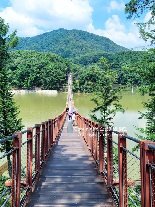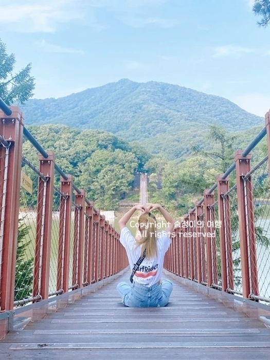 푸른 산을 끼고 있어 자연의 품속에 파묻힌 듯한 편안함을 느낌이 인상적이었던 마장호수도 경기도 드라이브코스 추천 장소입니다. 파주까지 드라이브를 즐겼다면 출렁다리와 호수 전체가 보이는 전망대까지 이어진 3.3km의 완만한 둘레길, 깔끔하게 조성된 공원으로 가볍게 산책할 수 있습니다. 아주 천천히 걸어도 1시간 정도 걸립니다. 출렁다리가 초록초록한 주변과 너무나 잘 어울려 마음이 덩달아 여유로워지는 파주 드라이브코스 명소였습니다.