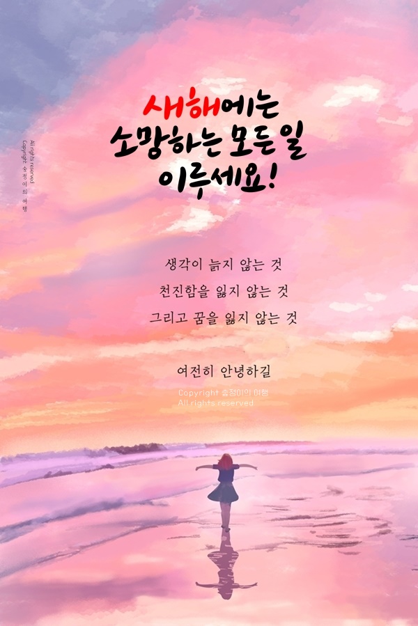 꿈의 크기를 비교할 필요는 없습니다. 중요한 것은 내가 정한 목표를 향해 꾸준히 나아가는 마음입니다. 남과 비교하지 않고 나만의 속도로 걸어갈 때, 진정한 기쁨과 행복이 피어납니다. 2025년에는 당신이 그리는 꿈을 향해 한 걸음씩 나아가며, 자신의 길에서 빛나는 순간들을 많이 만나시길 바랍니다. 작은 성취도 소중히 여기며, 당신의 노력과 걸음이 아름다운 결실로 이어지기를 응원합니다. 새해에도 웃음 가득한 한 해 되세요.