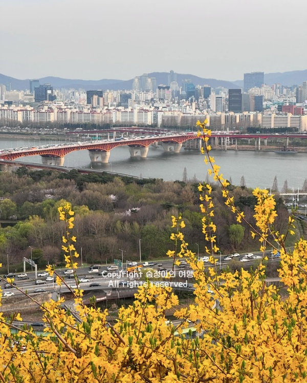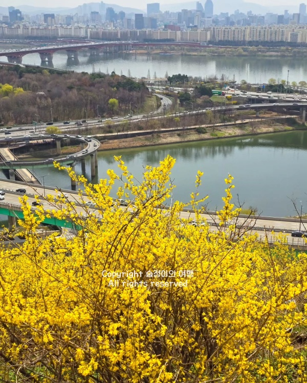 야간에 조명이 켜지면 노란 꽃잎과 화려한 야경이 어우러져 낮과는 완전히 다른 로맨틱한 분위기를 만끽할 수 있고요. 정상에서 내려다보는 한강의 탁 트인 뷰와 굽이치는 도로의 자동차 불빛들, 그리고 발밑의 샛노란 개나리 군락은 3월 국내여행지 베스트 10 추천에서만 맛볼 수 있는 화려한 시티뷰의 끝판왕입니다. 산 높이가 낮아 동네 뒷산 오르듯 가벼운 운동화 차림으로 훌쩍 다녀올 수 있으니 노란 기운 듬뿍 받으며 봄의 활력을 제대로 충전해 보시길 바랄게요.