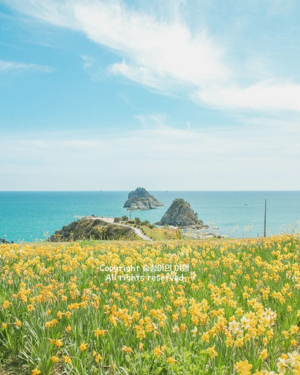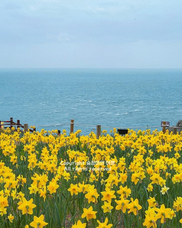 바다를 배경으로 활짝 핀 노란 수선화를 만날 수 있는 부산 오륙도 해맞이 공원은 3월에 꼭 가봐야 할 핫플레이스예요. 보통 3월 중순부터 바닷바람을 맞으며 노란 꽃망울이 터지기 시작하는데, 탁 트인 푸른 바다와 이기대 해안 절벽, 그리고 샛노란 수선화가 어우러지는 풍경은 보는 순간 입이 다물어지지 않을 정도로 웅장합니다.