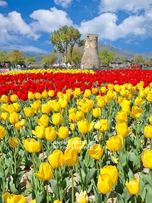 천년 고도 경주는 발길 닿는 곳마다 역사가 살아 숨 쉬지만, 3월 말부터 4월로 넘어가는 시기에는 첨성대 주변이 거대한 꽃대궐로 변신해서 무척 색다른 매력을 뽐냅니다. 벚꽃이 바람에 날릴 때쯤, 첨성대 주변 동부사적지 일대에는 노란 유채꽃과 형형색색의 튤립이 카펫처럼 깔리며 환상적인 봄의 풍경을 만들어내요. 옛 조상들이 별을 관측하던 고요한 석조 건축물 위로 원색의 튤립들이 고개를 내민 모습은 과거와 현재가 교차하는 듯한 묘한 울림을 줍니다.