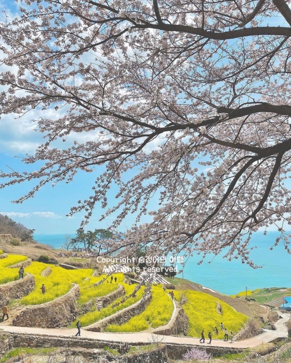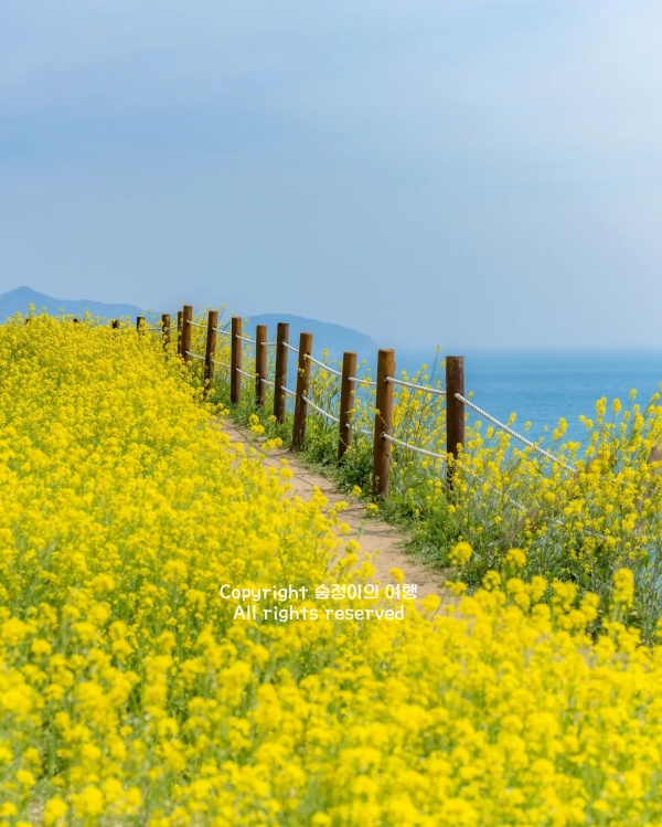 올해 남해 유채꽃은 3월 중순부터 시작해 말경이면 샛노란 절정을 뽐낼 거라고 하네요. 워낙 가파른 내리막길을 걸어 내려가야 해서 편한 신발은 필수지만, 바다와 유채꽃이 겹쳐 보이는 탁 트인 포인트에 서면 힘든 줄도 모르고 시간 가는 줄 모르게 머물게 됩니다. 날씨가 흐린 날에 방문해도 바다의 짙은 색과 쨍한 노란색이 강렬한 대비를 이뤄서 그 나름대로 아주 멋진 운치가 있더라고요. 남해의 따뜻한 햇살 아래서 노란 꽃망울들과 눈을 맞추며 걷는 시간은 이번 3월 국내여행지 베스트 10 추천 중 가장 시원한 기억을 남겨줄 거예요.