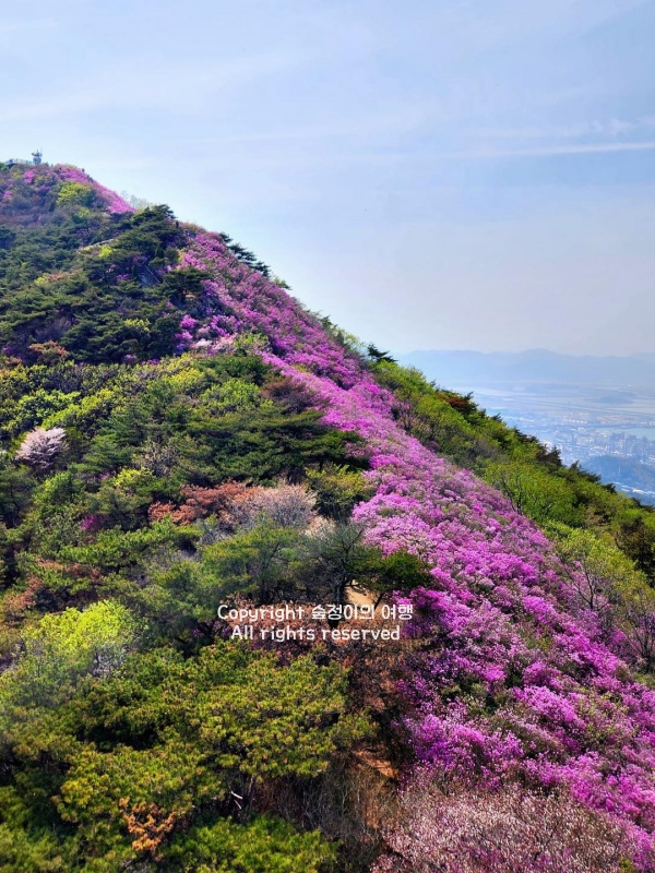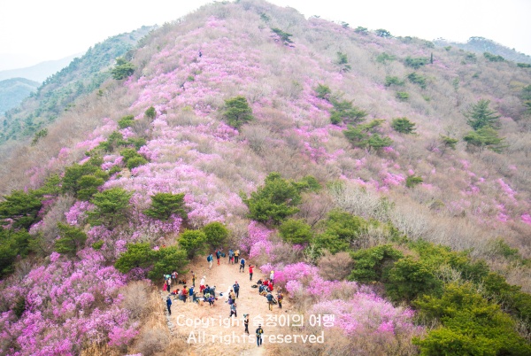 임도 삼거리에서 정상으로 향하는 코스가 비교적 걷기 수월하면서도 꽃이 가장 빽빽하게 뭉쳐 있어 인생 샷 건지기에 아주 좋고요. 잎보다 꽃이 먼저 피어나는 진달래라 어느 곳에 서서 셔터를 눌러도 화사한 봄의 색감이 가득 담깁니다. 땀 흘려 산행을 마친 후에는 가까운 여수 바다로 내려가 짭조름한 해산물로 배를 채우고 밤바다의 낭만까지 즐길 수 있으니 아주 알찬 하루가 되어줄 거예요.