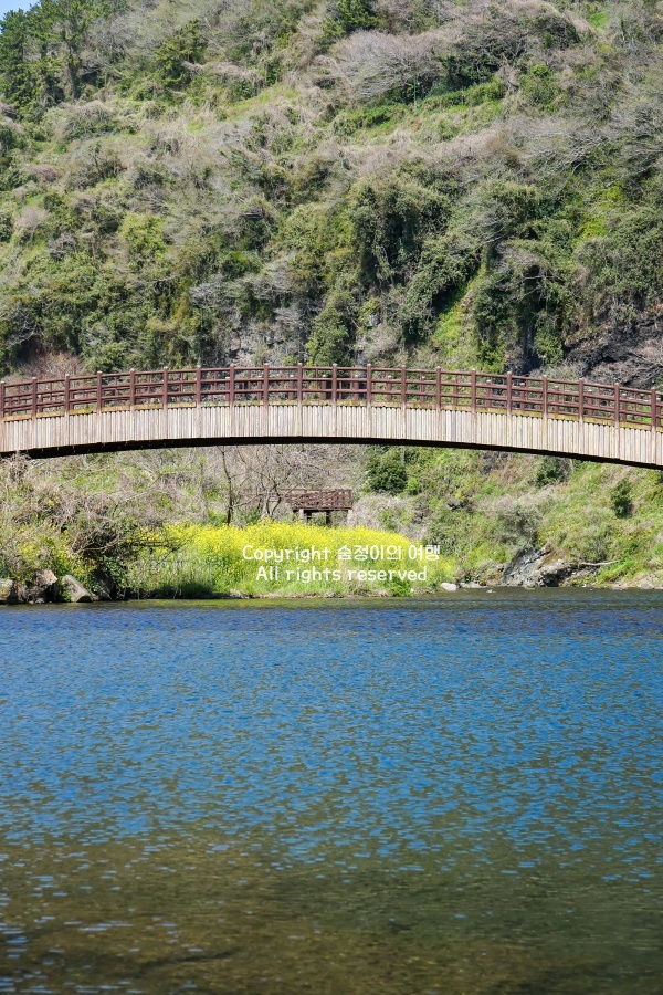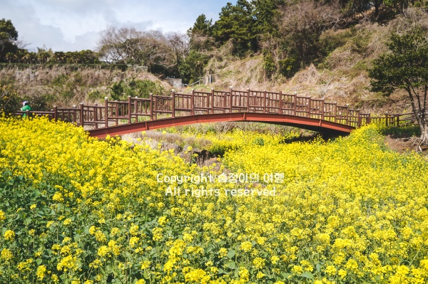 엉덩물 계곡은 3월 중문관광단지 가볼만한곳 10곳 유채꽃 명소입니다. 계곡 주변으로 노란 꽃이 가득 피어나고, 멀리 보이는 바다와 함께 어우러져 색다른 분위기죠. 길을 따라 걸으며 꽃과 바람을 가까이 느낄 수 있어 천천히 산책하기에 좋습니다.