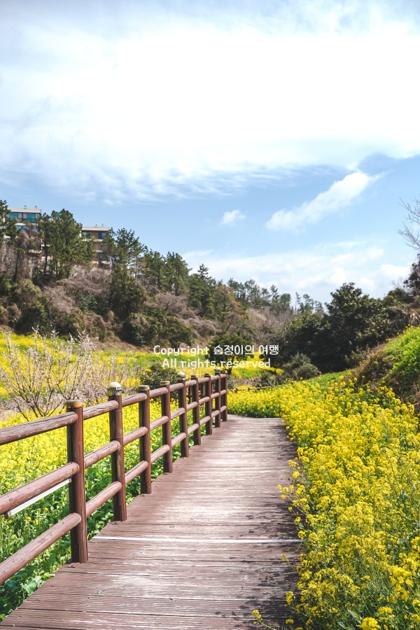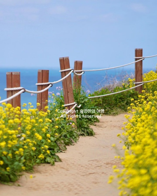 제주의 남서쪽 끝자락, 3월 제주도 가볼만한곳 10곳송악산 둘레길을 따라 걷다 보면 노란 유채꽃이 길을 따라 이어집니다. 한쪽에는 절벽 아래 부서지는 파도가, 다른 한쪽에는 넓은 들판을 따라 피어난 유채꽃이 가득합니다.