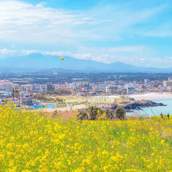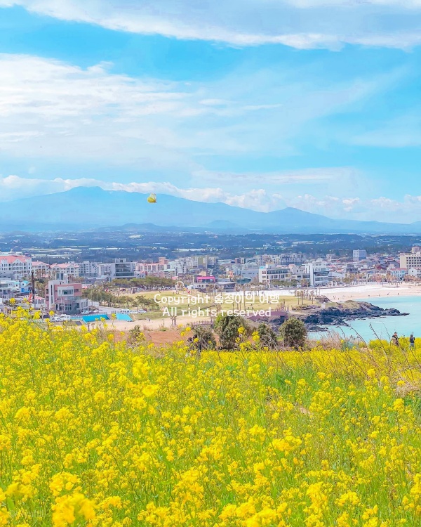함덕 해변을 따라 서우봉으로 올라가면 3월 제주도 가볼만한곳 10곳 제주를 온전히 담을 수 있습니다. 바닷바람을 맞으며 걷다 보면 유채꽃이 길을 따라 가득 피어 있습니다. 오르는 길이 완만해 산책하듯 천천히 걸어도 좋습니다.