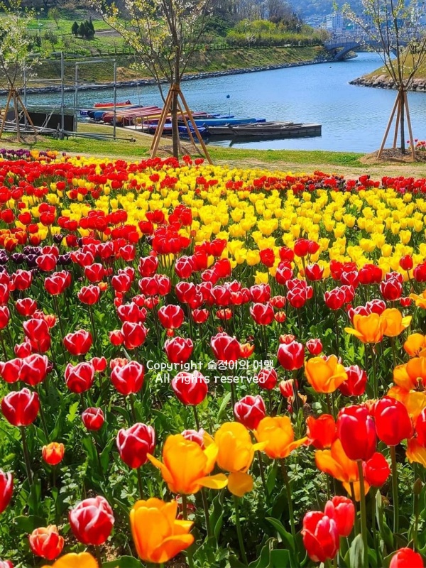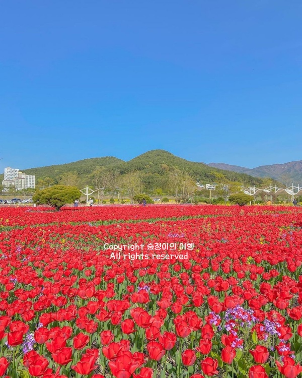 경남 양산시 물금읍 낙동강 둔치에 자리한 황산공원은 부산의 5대 생태공원보다도 넓다. 봄이면 공원 중부광장 일대에 형형색색의 튤립과 보랏빛 청유채꽃이 동시에 피어나 알록달록한 꽃밭이 조성된다. 무료 입장에 넓은 잔디밭과 강변 산책로까지 갖춰진 덕분에 피크닉 문화가 자연스럽게 정착한 곳이고, 주말이면 돗자리를 깔고 앉아 꽃을 바라보는 가족들이 강변을 채운다.