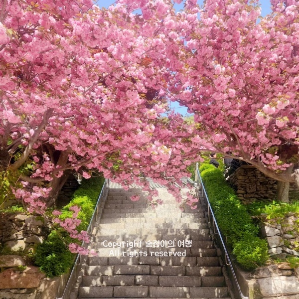 경남 사천 9경 중 하나인 청룡사는 와룡산 자락에 자리한 사찰로, 40년 전 장룡스님이 직접 심은 겹벚꽃 나무들이 진입로를 따라 자연스러운 터널을 이루고 있다. 원래 100여 그루였던 것이 현재 50여 그루로 줄었지만, 수령이 묵을수록 꽃의 밀도와 색감은 더 깊어졌다. 가장 유명한 포토존은 '극락 계단' 구간으로, 겹벚꽃이 낙화할 때 계단 위로 꽃잎이 쌓이는 장면을 담으려는 방문객들이 이른 아침부터 자리를 잡는다. 매년 4월 중순 겹벚꽃 개화에 맞춰 겹벚꽃 축제가 열리며, 호국승병재·음악회·마켓 등 다채로운 행사가 함께 진행된다.