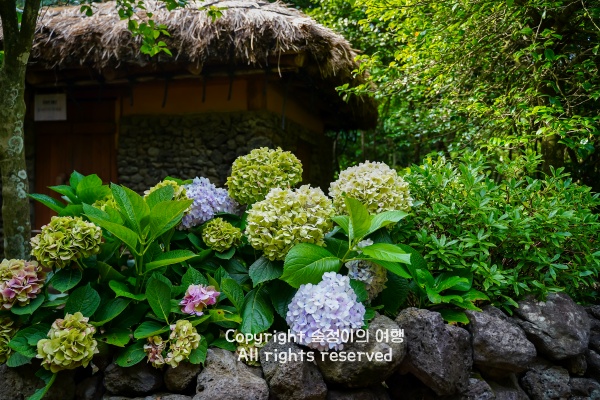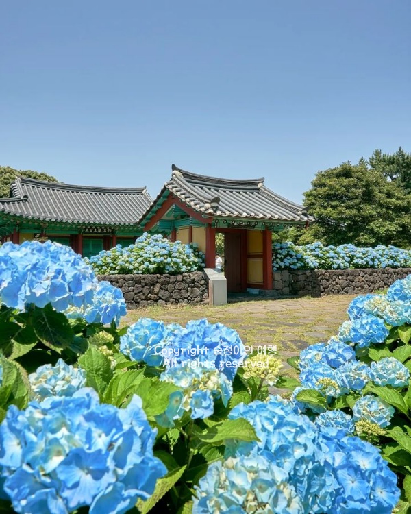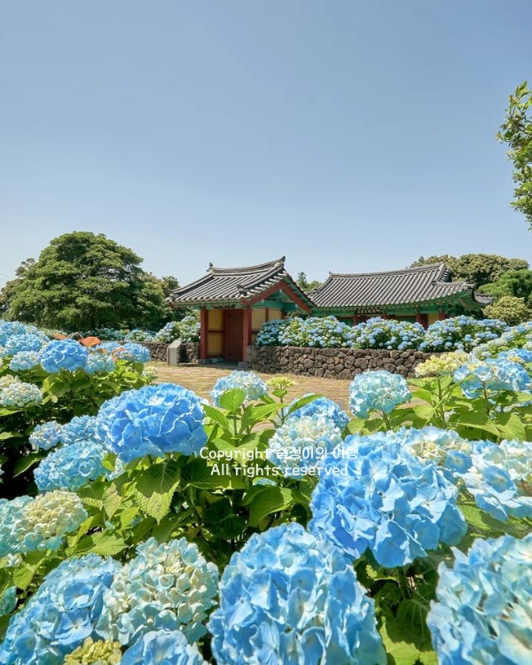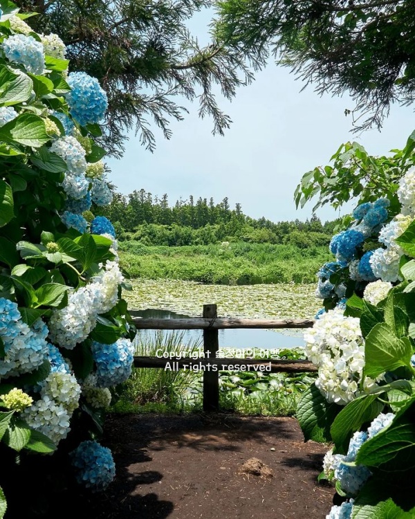 전체 관람은 30분이면 충분하지만, 생각보다 오래 머무르게 되는 분위기가 있어요. 길 옆에는 제주 전통 돌담과 나무가 함께 어우러져 있어서 수국만으로 끝나지 않는 풍경이 이어집니다. 여름날 피서 겸 나들이로 잘 어울리고 인파에 치이지 않아 부담 없이 다녀올 수 있는데 혼인지는 여름 수국이 왜 좋았는지 기억하게 해주는 여름에 제주도 가볼만한곳 10곳이었어요.