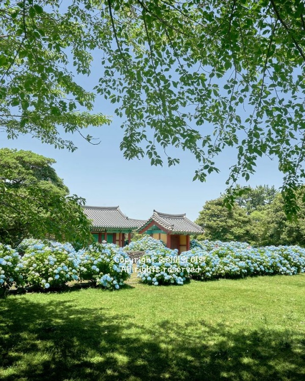 혼인지는 조용한 마을길 안쪽에서 만나는 수국 명소입니다. 입장료가 없고, 상업적인 공간이 아니라서 산책하듯 수국을 감상하기에 더 좋았어요. 수국은 혼인지 정문 쪽에 몰려 있고, 꽃 상태가 좋아서 사진 찍는 사람들이 많았습니다. 흰색과 연한 하늘빛 수국이 많고, 군락 사이로 난 짧은 돌길 위를 걷는 구조라 꽃을 가까이서 볼 수 있었고 6월 중순부터 하순 사이가 가장 풍성한 시기라 한창 피었을 때 가면 수국 벽 사이를 걷는 기분이 들어요.
