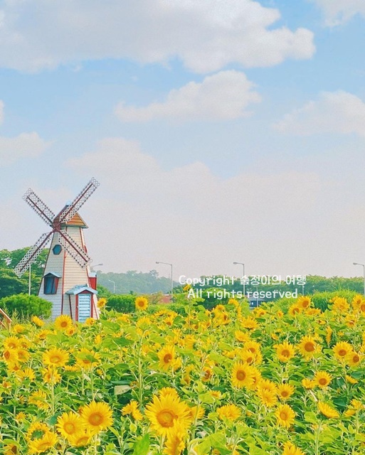 7월 중순 이후면 노란 물결을 볼 수 있는 매년 7월 서울근교 가볼만한곳 베스트 10 해바라기 스팟으로 핫한 곳입니다. 생각보다 넓고 사람도 얼마없어서 찍는 내내 감탄했고 안성팜랜드처럼 넓은 부지는 아니지만 서울 근교에서 볼 수 있는 해바라기중엔 꽤나 넓고 생생했습니다. 랜드마크인 풍차와 해바라기를 같이 담으면 더 예쁩니다. 15분에 한대씩 비행기가 지나가서 해바라기랑 담기 좋은 곳이기도 합니다.